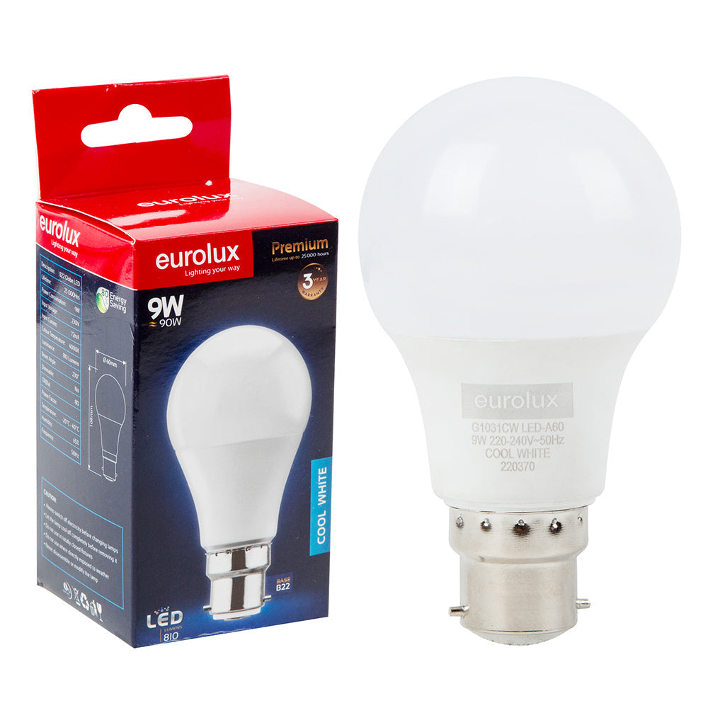 EUROLUX LED COOL WHITE GLOBE OPAL A60 9W B22 G1 G1031CW